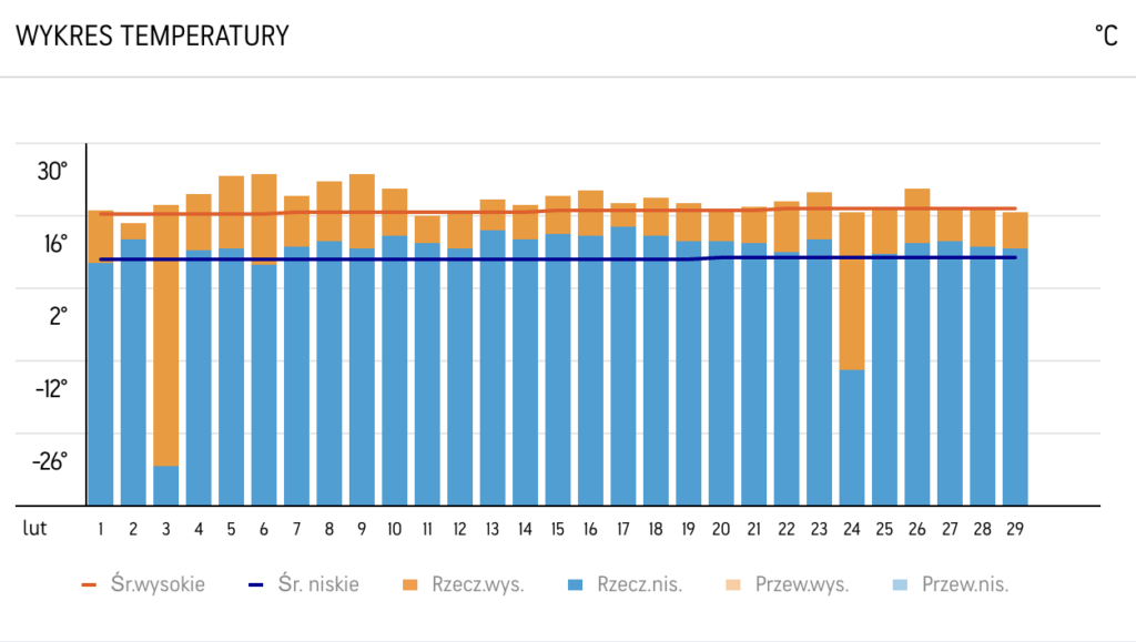 | Miejsce | Temperatura w dzień | Temperatura w nocy | Czas trwania dnia | Czas trwania nocy | Opady w mm |