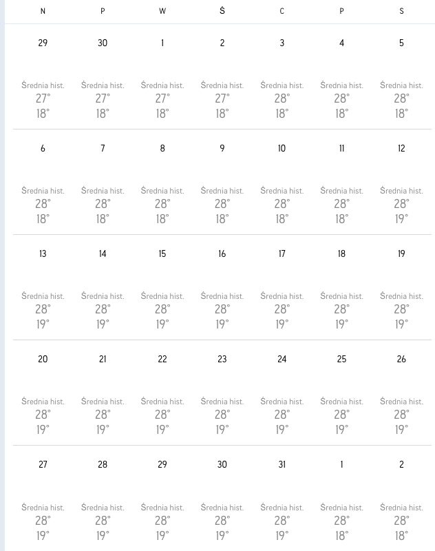 | Varna | 26°C | 19°C | ~15 godzin | ~9 godzin | 30 mm |
