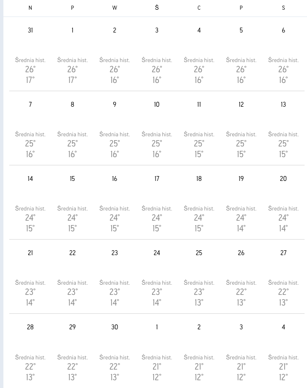 | Varna | 24°C | 15°C | ~12 godzin | ~12 godzin | 32 mm |