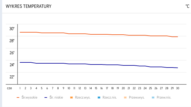 | Miejsce | Temperatura w dzień | Temperatura w nocy | Czas trwania dnia | Czas trwania nocy | Opady w mm |