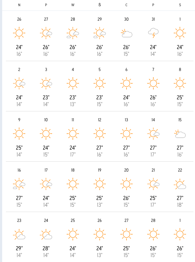 | Dubaj | 25°C | 17°C | ~11 godzin | ~13 godzin | 10 mm |