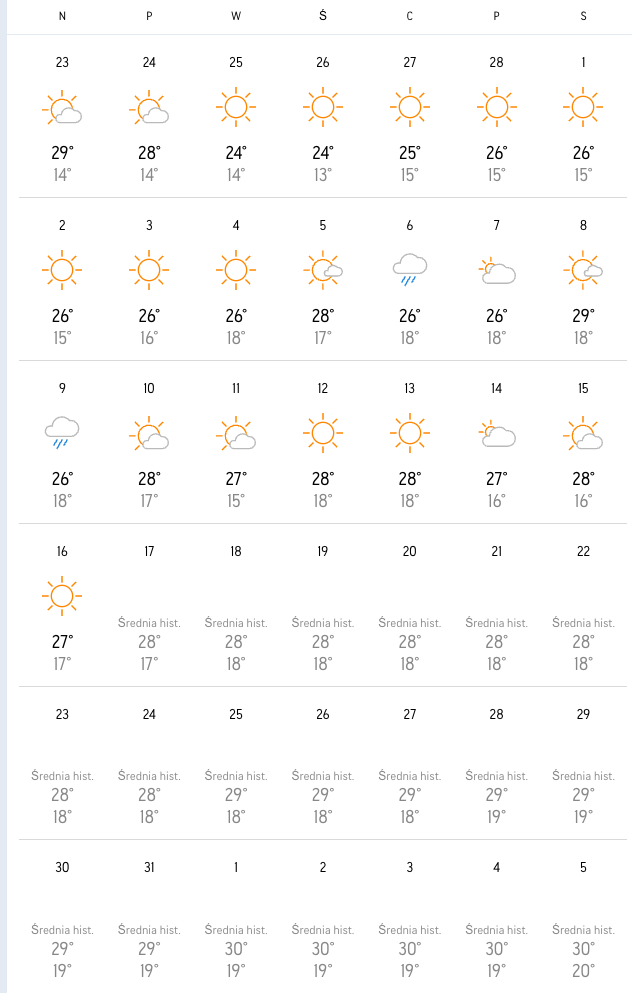 | Marina | 27°C | 21°C | ~12 godzin | ~12 godzin | 8 mm |
