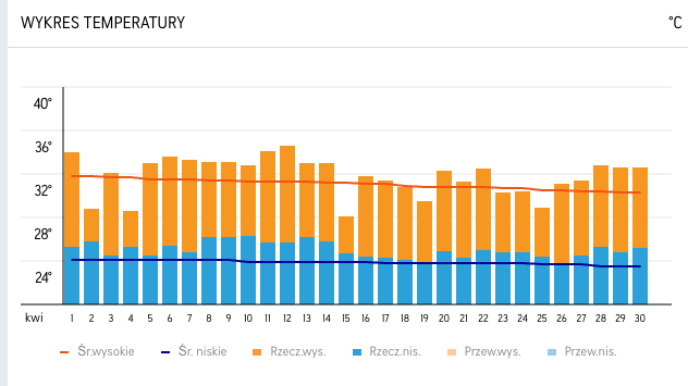 | Miejsce | Temperatura w dzień | Temperatura w nocy | Czas trwania dnia | Czas trwania nocy | Opady w mm |
