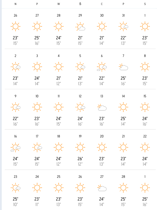 | Marsa Alam | 25°C | 16°C | ~11 godzin | ~13 godzin | 1 mm |
