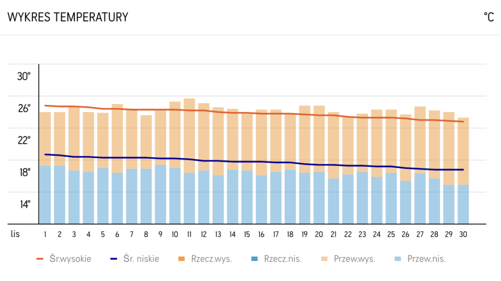 Jeśli marzysz o ucieczce od jesiennej szarości, Wyspy Kanaryjskie w listopadzie to idealny wybór. W tym czasie pogoda na tych hiszpańskich wyspach jest wyjątkowo łaskawa. Średnia temperatura powietrza wynosi około 24°C, co sprawia, że możemy cieszyć się ciepłym słońcem i przyjemnymi wieczorami, unikając letnich upałów.